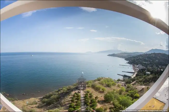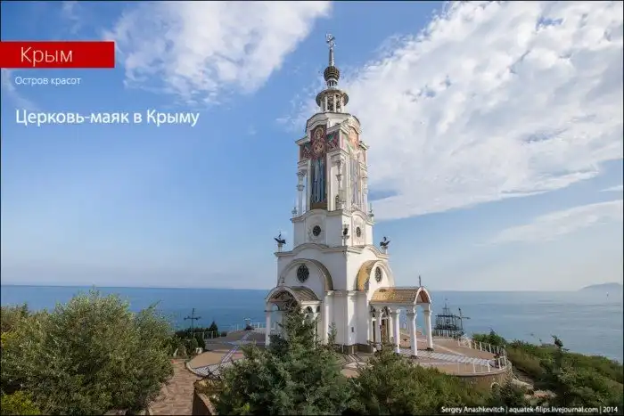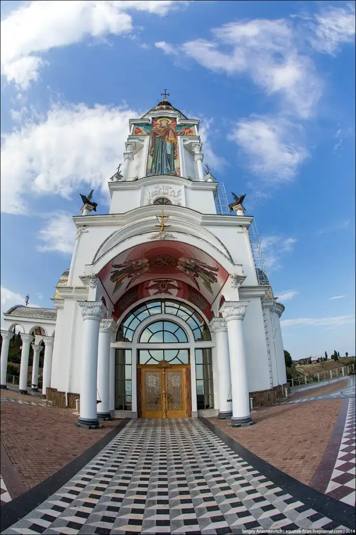 Это самый высокий и один из самых молодых храмов в Крыму. И, наверное, самый необычный. Во-первых, у церкви Св. Николая Мирликийского нет традиционного купола. Вместо него церковь венчает золотой крест, под которым шар – символ Земли. Во-вторых, эта церковь является маяком – в шар под крестом устроен маяк для морских судов. В темноте он светится.