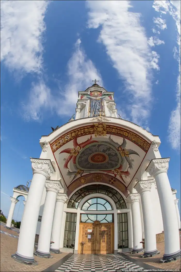 Храм построен на скале у моря на трассе Алушта-Судак. Возвели его в 2006 году на спонсорские средства.