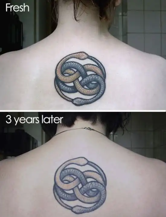 Когда кто-то делает себе татуировку, он вряд ли задумывается над тем, как она будет выглядеть, спустя некоторое время. В этой подборке вас ждут фото татуировок, сделанные вскоре после того как они были набиты, и спустя несколько лет.
