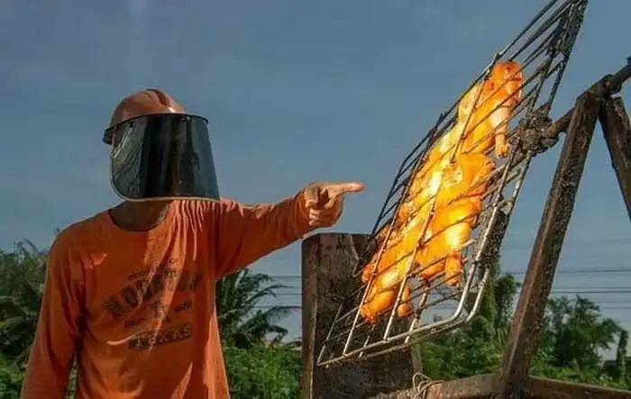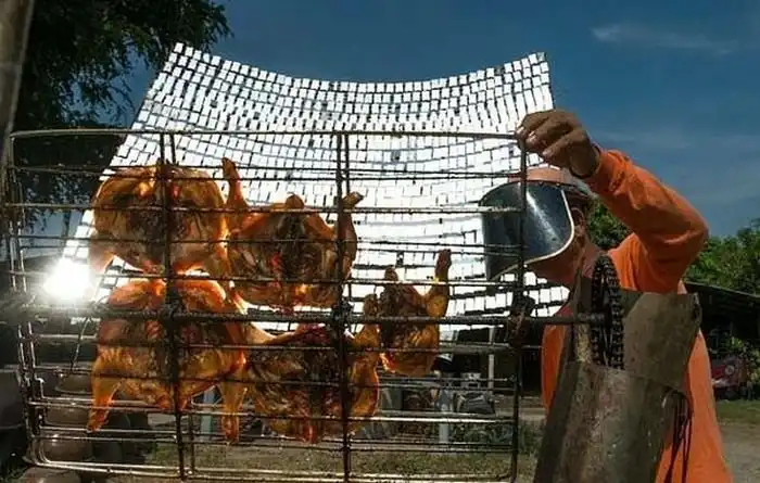 Продавцы уличной еды готовы на все, чтобы привлечь больше покупателей к своему прилавку. Для этого используются различные способы, но одним из самых действенных методов является изобретение новой технологии приготовления пищи. Так, например, этот торговец из Таиланда пришел к тому, что начал жарить курицу с помощью солнечных лучей и более тысячи зеркал. Он соорудил солнечную жаровню нехитрой конструкции, и готовит еду прямо на глазах у своих клиентов. Не удивительно, что попробовать подобную курицу желают многие, так как всем интересно, прожариться ли полностью мясо при такой обжарке или нет.