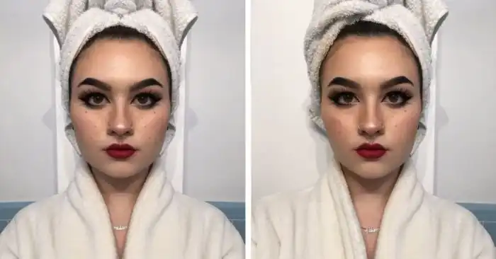 Девушке все говорили, что у неё симметричное лицо. Она решила сделать два фото: одно обычное, а на другом одна половина лица совмещена с её зеркальной копией.