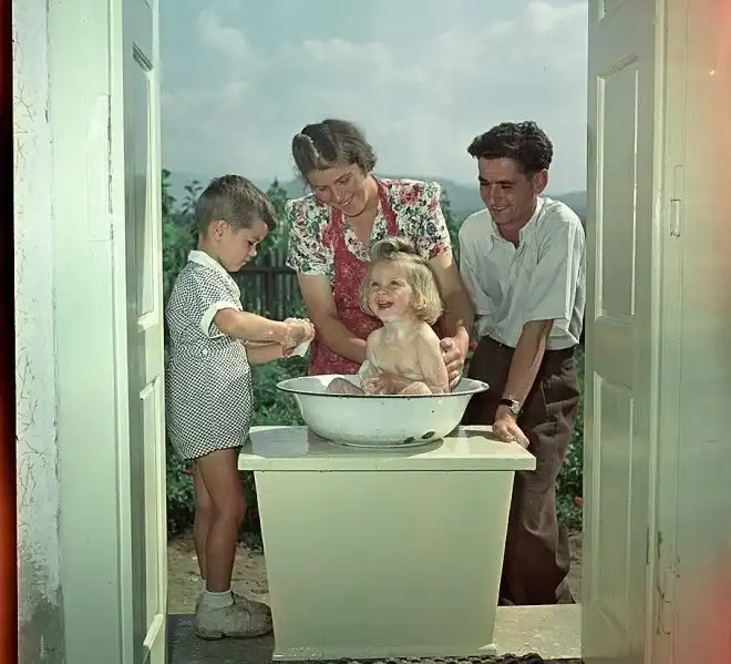 «Шофер Свалявского леспромхоза Эрнст Вагнер только что кончил смену. Но дома его ждет новая “работа”: нужно помочь жене выкупать дочь», — писал «Огонек», рассказывая о новом, социалистическом быте Закарпатья, только лет 10 как присоединившегося к советской семье народов.