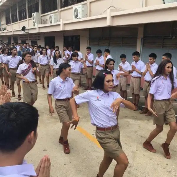 Пользователь Facebook выложил фотографии, сделанные в одной из школ провинции Чайяпхум в Таиланде. На снимках видно, как ученики рукоплещут танцующим в форме девушкам. Казалось бы, ничего необычного, если бы не один нюанс - плясуньи с длинными волосами и макияжем на самом деле мужского пола. Так детей поощряют выглядеть так, как им нравится.