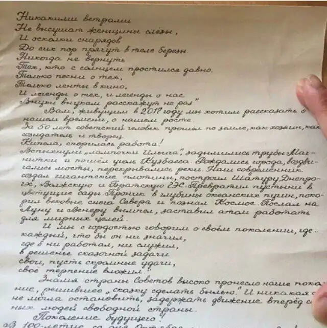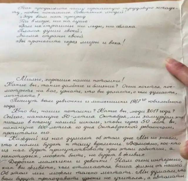 На торжественной линейке, прошедшей в школе №1 города Темиртау, Карагандинская область, Казахстан, была вскрыта капсула времени, заложенная 50 лет назад. Капсулу с посланием ученикам заложили педагоги и школьники, работавшие и учившиеся в школе 50 лет назад. На последний звонок для открытия капсулы времени были приглашены и те, кто ее закладывал. Слова послания сильно растрогали нынешних выпускников, и они решили заложить свою капсулу времени для следующего поколения. «Так уж повелось на нашей земле, что героическую эстафету о делах и свершения принимает новое поколение. Мы думаем, что вам будут преподавать уроки не учителя, а роботы. Физический труд уступит место умственному, а искусственное станет не хуже природного. Мы верим, что на других планетах уже открыта жизнь, и вы уже станете свидетелями этих открытий», - говорилось в письме.
