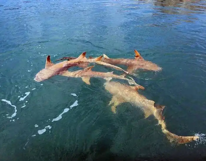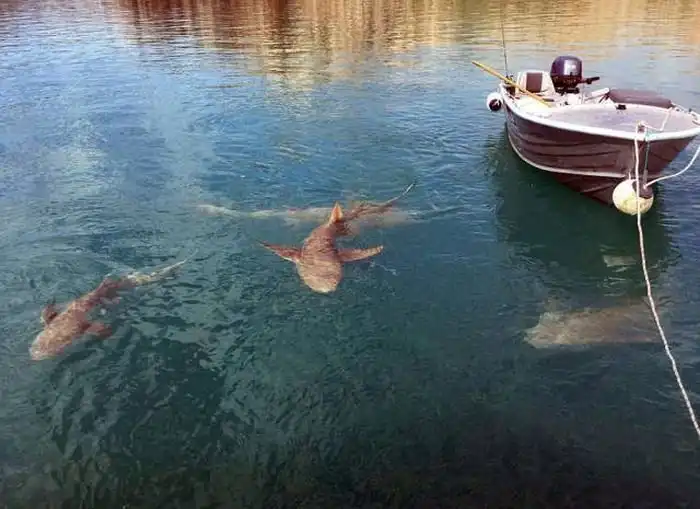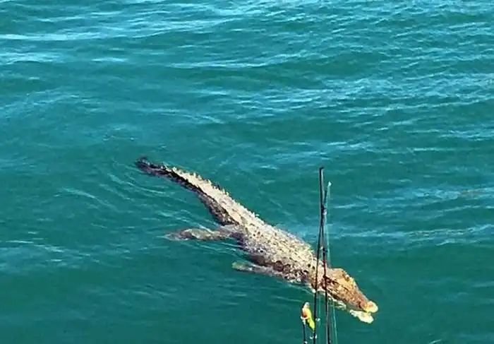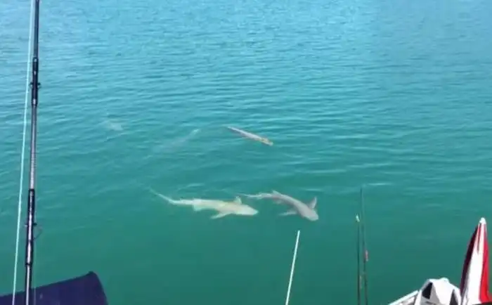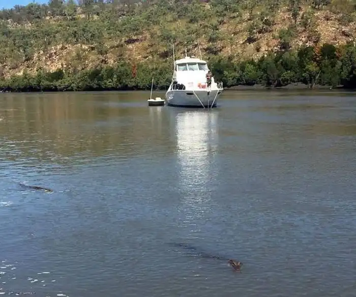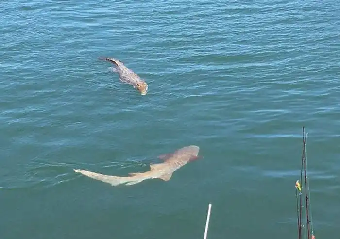 Туристы Марг и Кит Томас решили немного порыбачить со своей лодки на реке Хантер в округе Кимберли Западной Австралии, чем привлекли к себе внимание местных хищников. Лодку окружила стая лимонных акул, к которым также присоединились гребнистые крокодилы. Хищники не обращали внимания друг на друга и искали, чем поживиться, поэтому туристам пришлось отложить рыбалку до лучших времен.