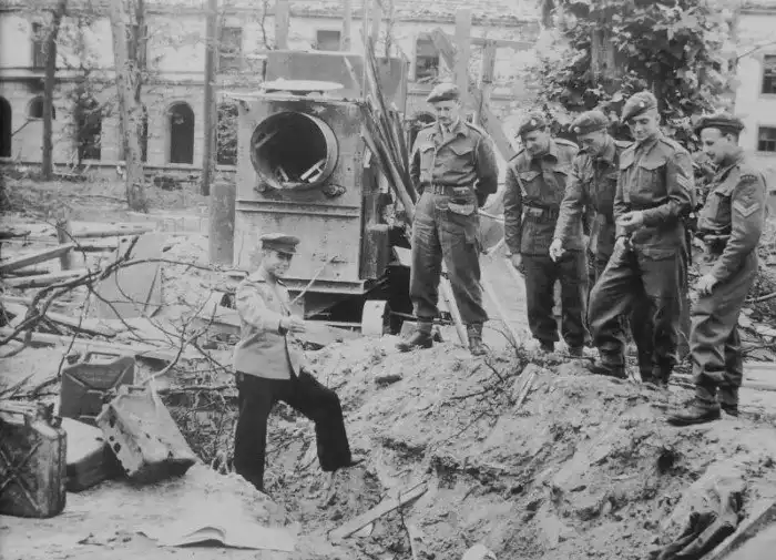 Советский офицер показывает британским военнослужащим место находки останков Гитлера.