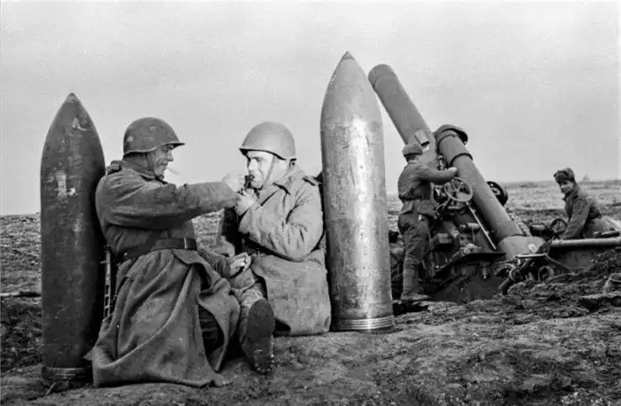Красноармейцы-артиллеристы расчета 280-мм мортиры образца 1939 года (Бр-5) отдыхают у снарядов. СССР. 1941-1945 годы.