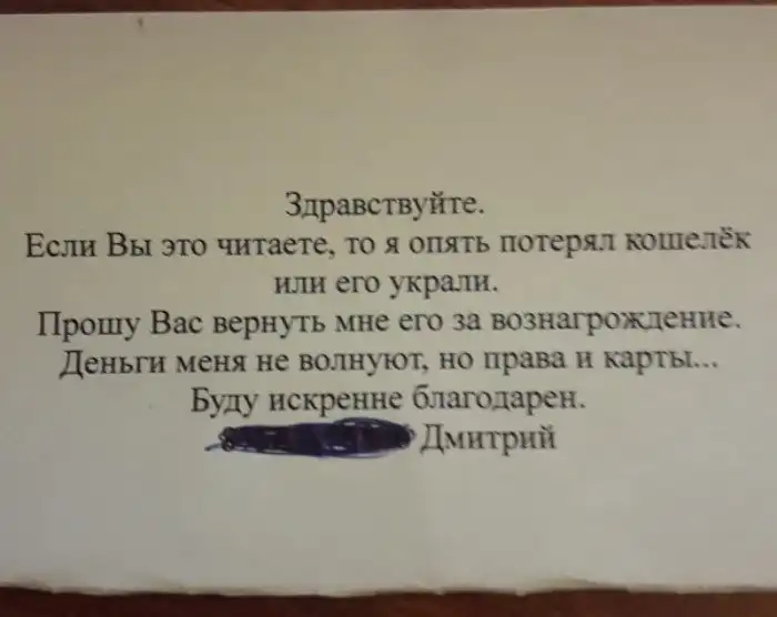 Но я задумался, сколько раз нужно потерять бумажник, чтобы в нём записку оставить?