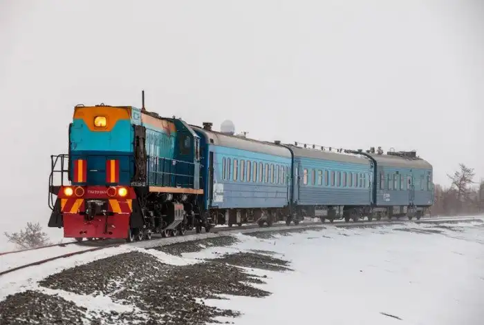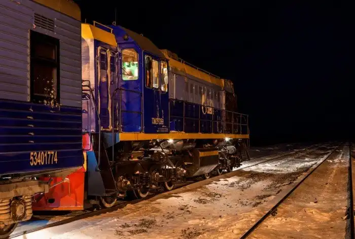 Наш чартерный поезд. Обратите внимание на последний вагон — это дизель-генератор. Все поезда ходят с ним, на случай если локомотив вдруг заглохнет или сломается. Тогда этот вагон обеспечит теплом и электричеством. Плюс там живет локомотивная бригада. Вахта — месяц, рабочий день — 12 часов. Потом идешь спать в вагон, а твои коллеги — в кабину локомотива.