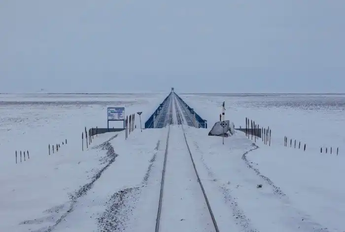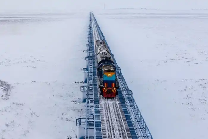 Самый длинный мост (3,9 км) за полярным кругом. Построен в 2008—2009 годах. Трубки в насыпи — это вот как раз холодильники для ее заморозки.