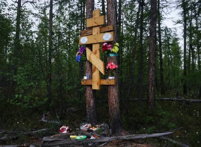 Работа черного копателя тяжела и опасна. Это памятник двум молодым копателям, продавшим бивней больше чем на $100 000 и на радостях утонувшим в реке, будучи пьяными.