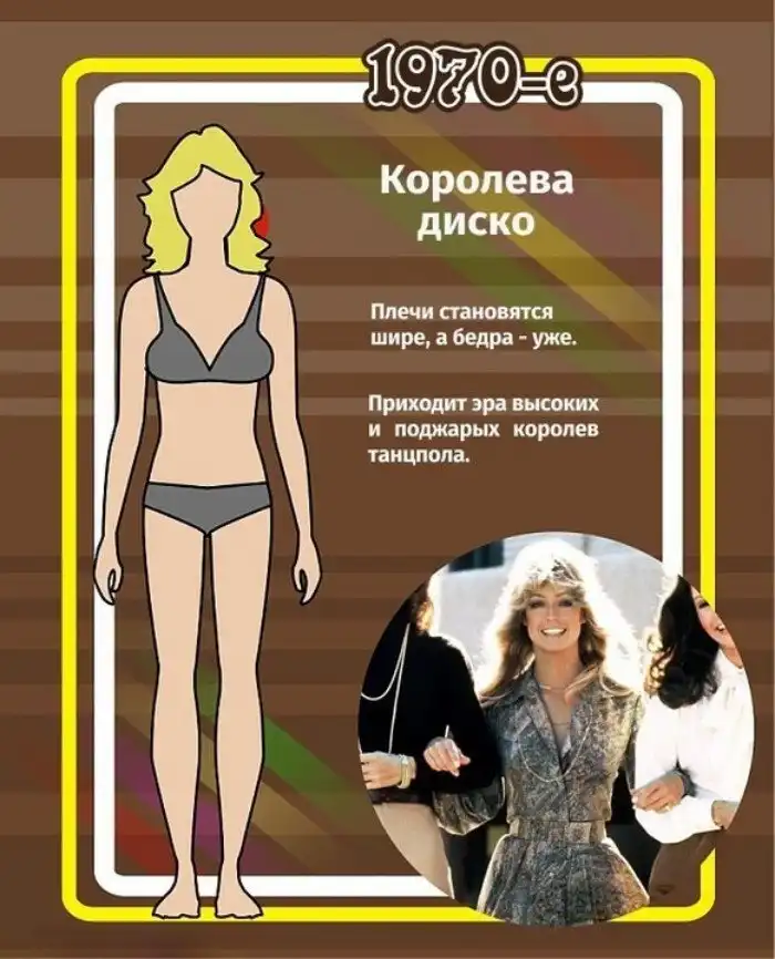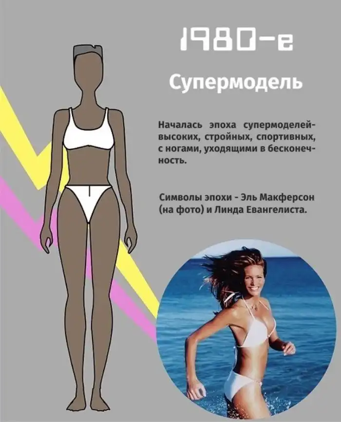 Главное для идеала 1980-х - спортивный внешний вид. Сплошные мышцы и ни грамма жира! Бедра при такой фигуре должны быть слегка шире бюста.