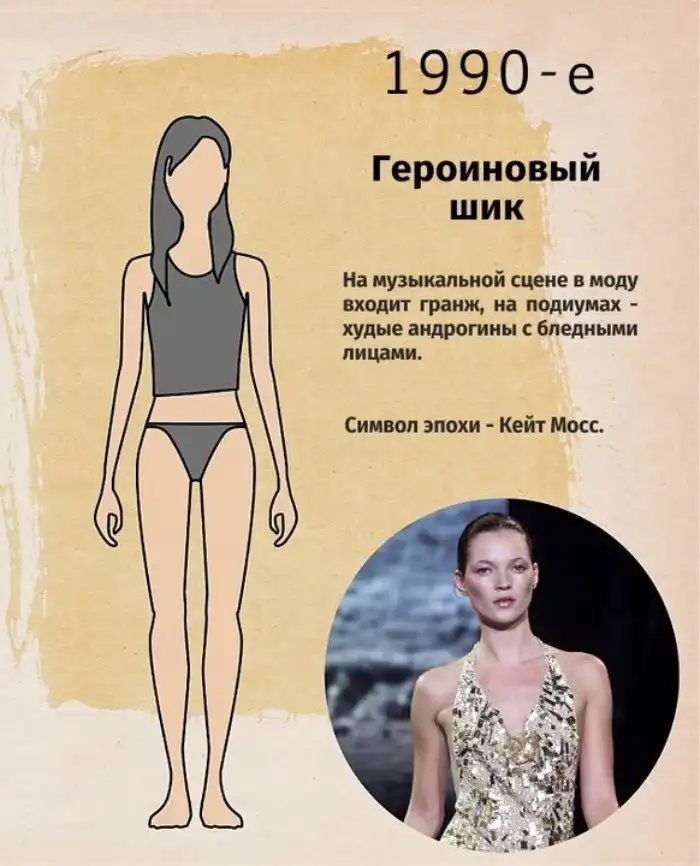 Кейт Мосс ввела моду на "героиновый шик" - болезненную худобу, выступающие скулы, пустые глаза.