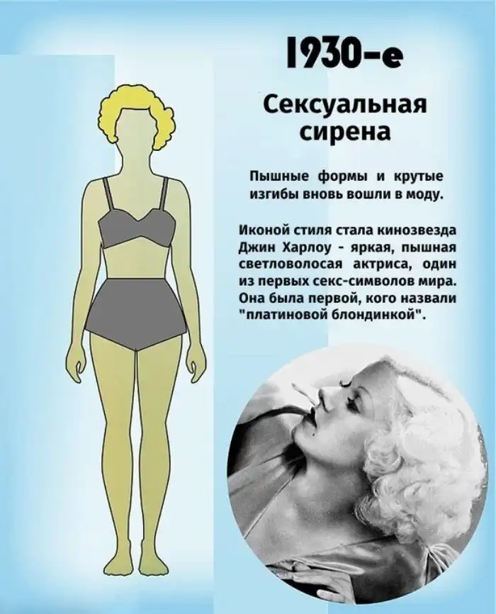 В 1930-х пышные формы вновь входят в моду. Короткий подол - уже не новость, но теперь женщины осмеливаются оголять еще и плечи. Медиа подхватывают образ чувственной, сладострастной женщины, который позднее ляжет в основу образов кинодив 1940-х.