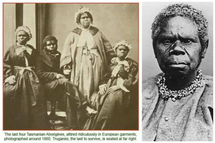А к 1835 г. местное население было полностью ликвидировано. Последние выжившие тасманийцы (около 200 человек) были переселены на остров Флиндерс в Бассовом проливе. Одна из последних чистокровных тасманиек, Труганини, умерла в 1876 году.