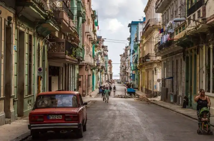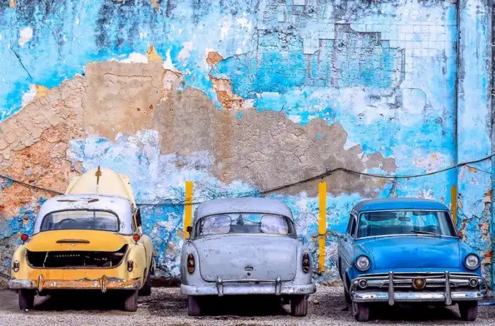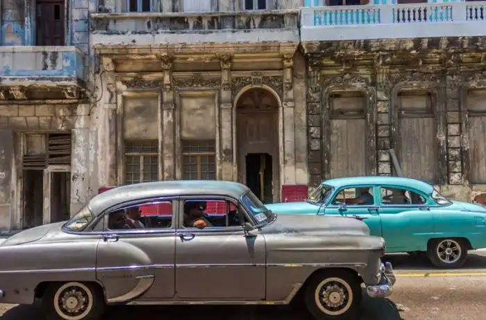 Старые машины проезжают мимо разрушающихся прямо на глазах зданий
