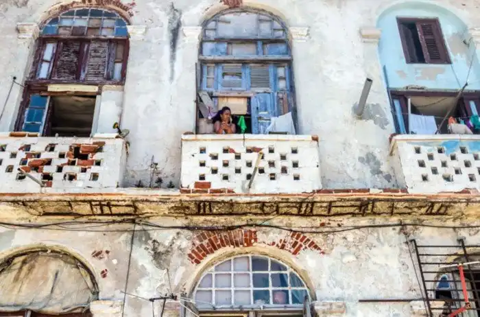 Кубинская разруха. Женщина смотрит на Малекон из окна своего старого дома