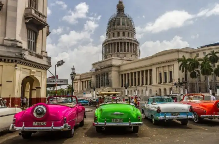 Ретромашины, которые туристы используют как такси, выстроились перед зданием Капитолия в центре Гаваны