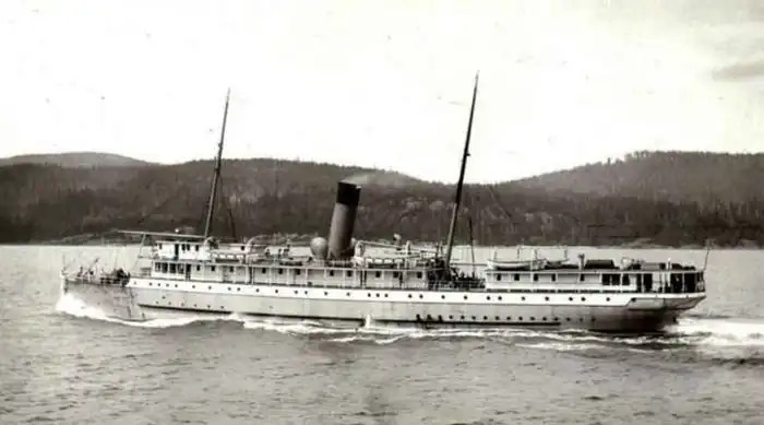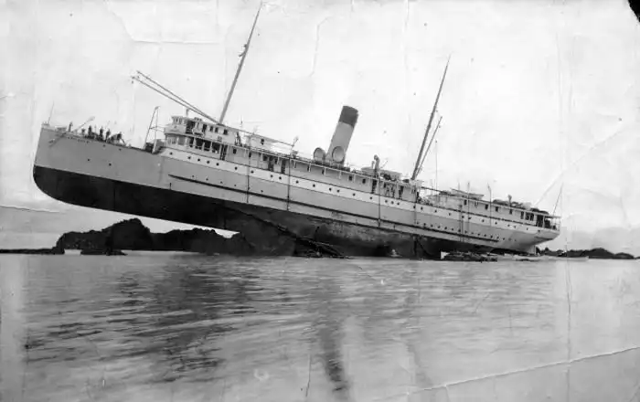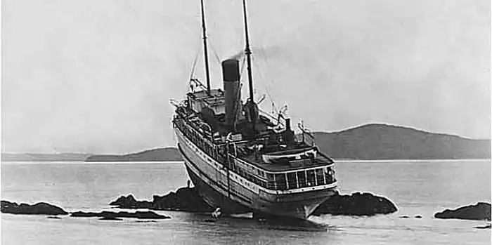 Перед вами судно «Принцесса Мэй» (Princess May), которое 5 августа 1910 года, село на мель вблизи западного побережья Северной Америки. Грузопассажирское судно длиной 76 метров оказалась на скалистых рифах, простояв на них около месяца, пока его не спасли. Инцидент произошел ранним утром в условиях тумана, когда камни были скрыты водами прилива. Все пассажиры и экипаж добрались до берега на шлюпках, а после отлива судно полностью оказалось на камнях. Примечательно, что основные повреждения были получены им в момент спасательной операции, когда во время отлива его с помощью буксира вернули на воду. После ремонта, который обошелся в 20 000 долларов, судно продолжили эксплуатировать и списали только в 1935 году.
