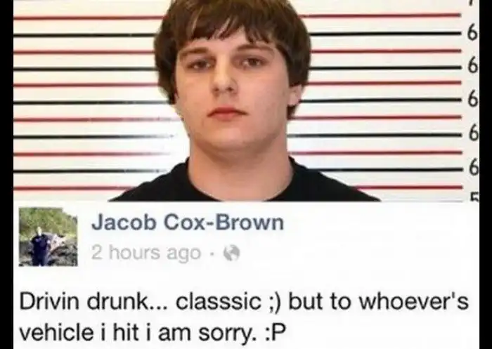 Еще один нетрезвый водитель — 18-летний Джейкоб Кокс-Браун, случайно ударивший чужую машину. Это событие вдохновило его написать в фейсбук такое сообщение: «Был пьян за рулем… Как обычно. Прошу прощения у человека, чей автомобиль я задел. Мне жаль».