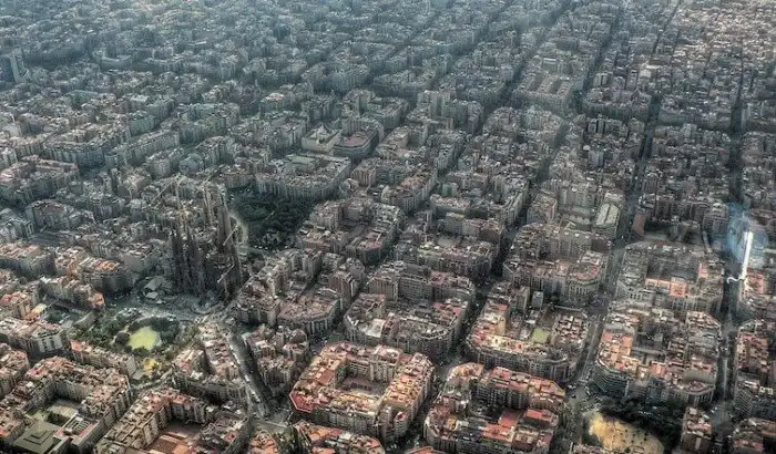 Вид на Барселону с высоты птичьего полета. Слева - Саграда-Фамилия, храм Святого Семейства