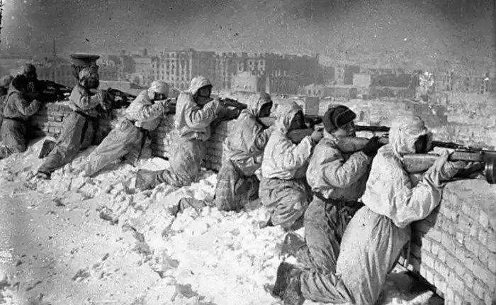 Советские автоматчики на крыше дома в Сталинграде, январь 1943 года