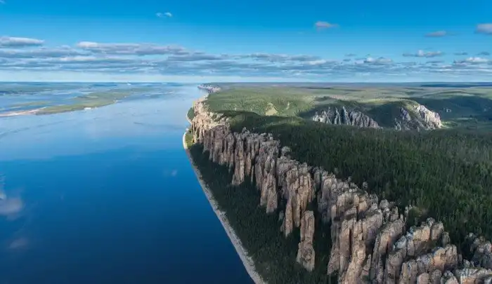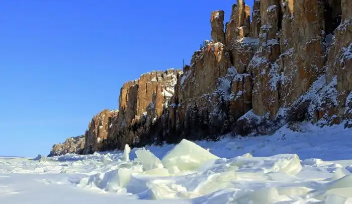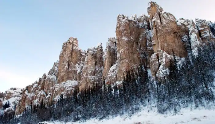 Ленские столбы — продукт экстремальных температур. Местный якутский климат с очень холодной зимой и очень жарким летом поспособствовал созданию этих великолепных известняковых отложений.