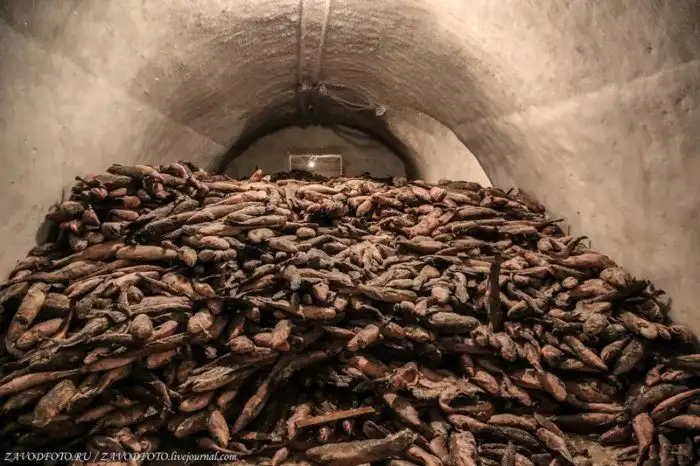 В приказе по рыбозаводу № 224 от 3 декабря 1950 года: «… Основание входной части тамбура должно располагаться на уровне 2-х метров над высшим уровнем воды в бухте. Тамбур, размером первой части 6,5 на 4,6 м. делается бревенчатый, а вторая часть из двойных плах с засыпкой между ними опилом размером 3,5 на 4,6 м. Входной коридор проходит в грунтах с наклоном от горизонтали 15 градусов, с расчетом углубления подошвы камер от поверхности земли на 12-13 м. Проходку коридора, камер хранения и заморозки рыбы проводить согласно прилагаемого проекта постройки вечномерзлотного холодильника, предложенного т. Бекманом Г.Ю. Для предотвращения размыва косогора под тамбуром произвести установку 15-ти метрового ряда свай на плесе с глубиной заложения концов свай 1,5 метра. Руководство по ведению земляных работ поручаю Бекман Г.Ю. Строительство тамбуров, дверей, холодильника подземелья, построек вентиляционных шахт и установку свай для укрепления берега поручаю Долгих И. Д….»