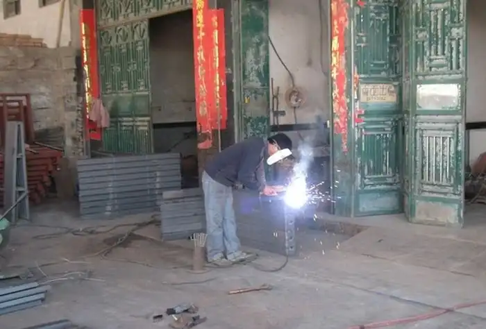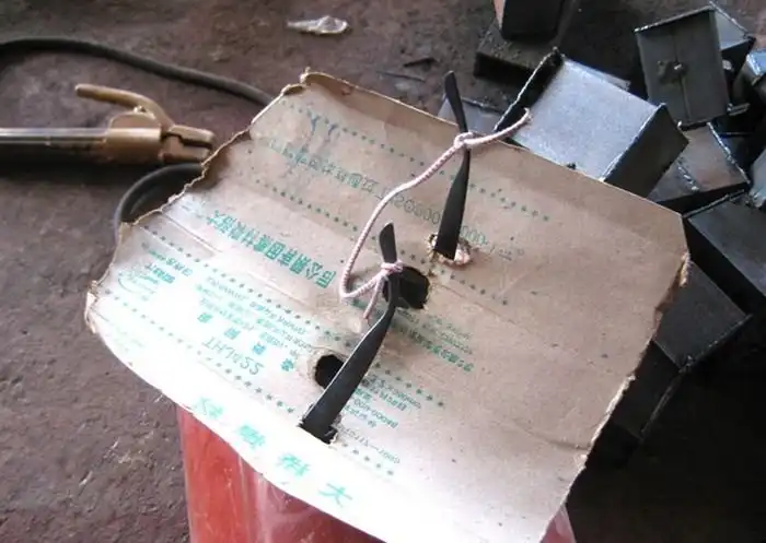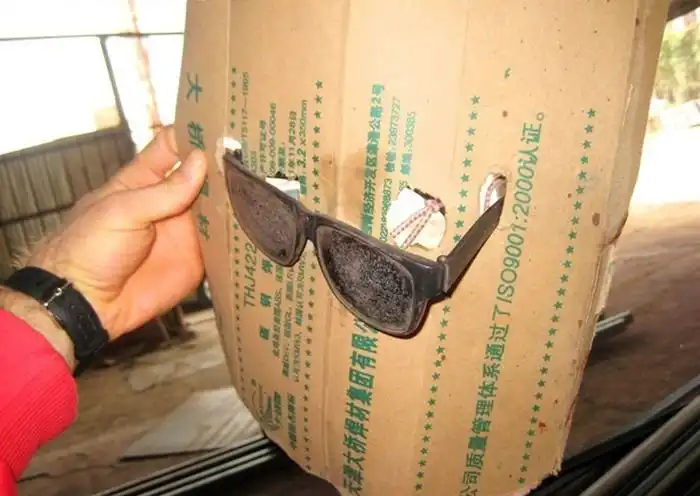 Вот такими вот самодельными масками пользуются китайские сварщики, изготавливающие их из подручных средств. Для создания такой маски необходим кусок картона, веревка и очки. Стоимость очков 4 юаня (чуть больше полдоллара), а картон и веревку можно достать бесплатно. Хватает такой маски примерно на полмесяца ежедневной работы, так как попадающие на очки искры понемногу плавят их стекла.