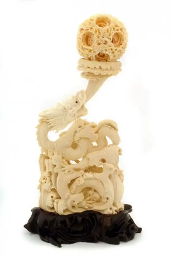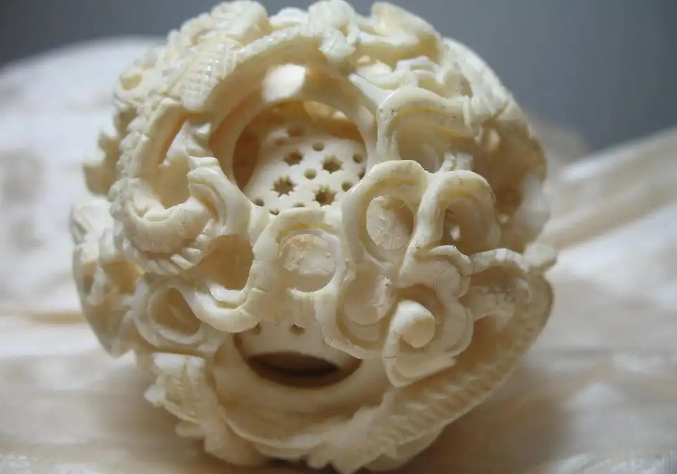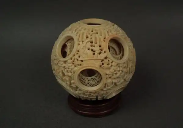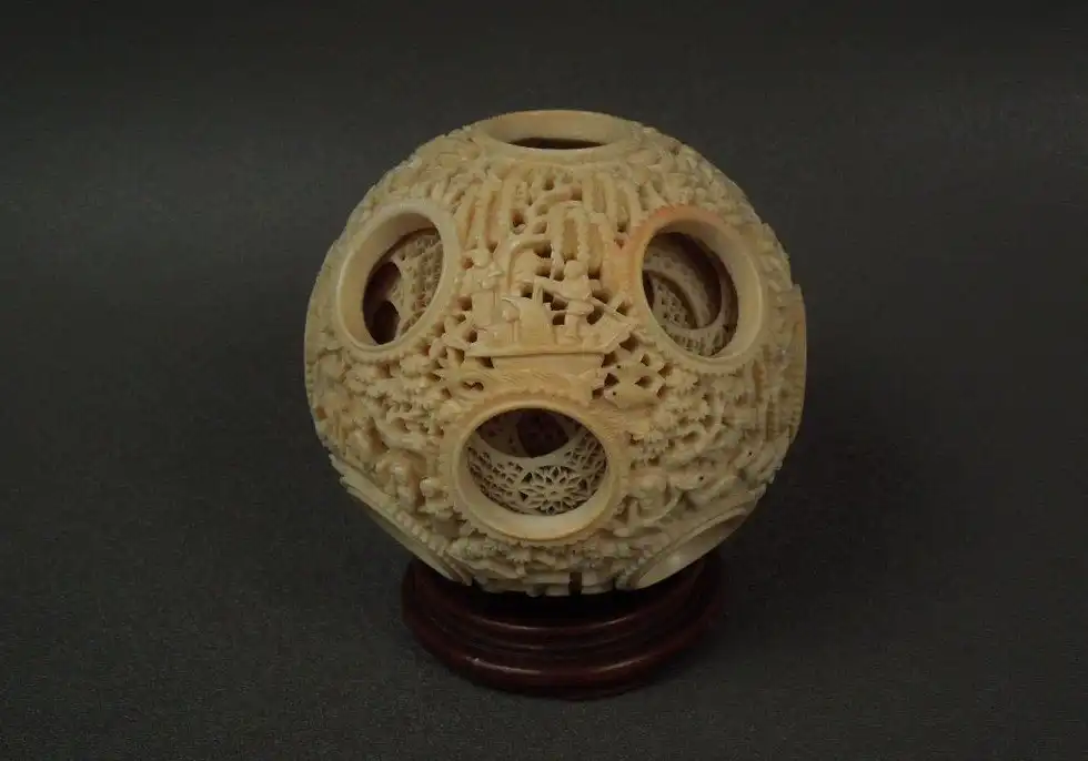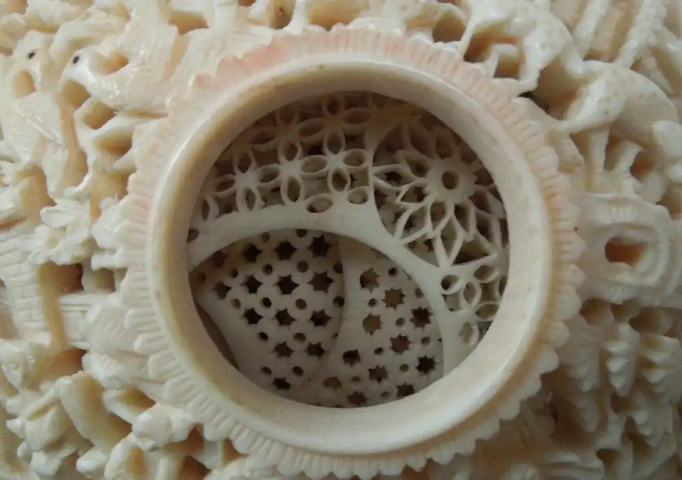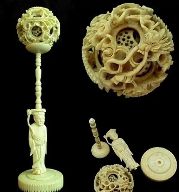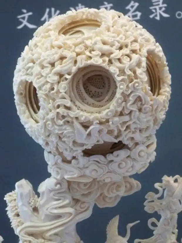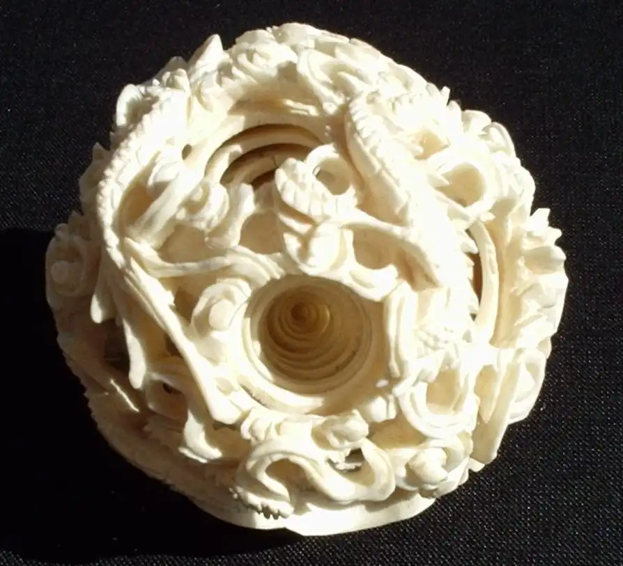 Настоящей жемчужиной среди прочих шедевров, выполненных из слоновой кости, признаны «решетчатые шарики внутри шариков» . Первым шагом в изготовлении этого чуда является превращение куска кости в идеальный шар, после чего в нем на необходимом расстоянии просверливаются несколько отверстий конической формы, чьи вершины сходятся точно в центре шара. Затем мастер с помощью линейки отмечает в каждом отверстии, сколько шариков он хочет выгравировать внутри первого.