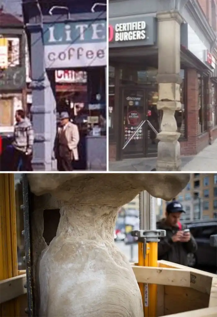 Эта колонна у бара в Торонто, похоже, много лет поддерживала его посетителей. За десятилетия она истерлась так, что превратилась в тонкую каменную скульптуру