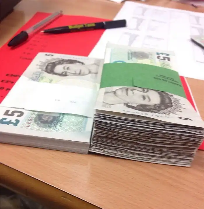 Слева - пачка новеньких купюр, справа - такая же по размеру стопка купюр, но долго бывших в употреблении