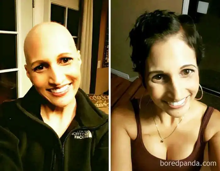 "Год назад у меня не было выбора - пришлось побриться налысо из-за химиотерапии. Теперь - я здорова! Правда, растут сумасшедшие завитушки"