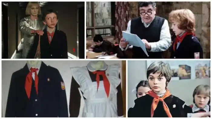 Школьная форма 80-х вспоминается по фильмам "Приключение Электроника", "Гостья из будущего", "Школьный вальс". на мальчиках - те же синие костюмы, на девочках - форменные платья плюс обязательный пионерский галстук или комсомольский значок.