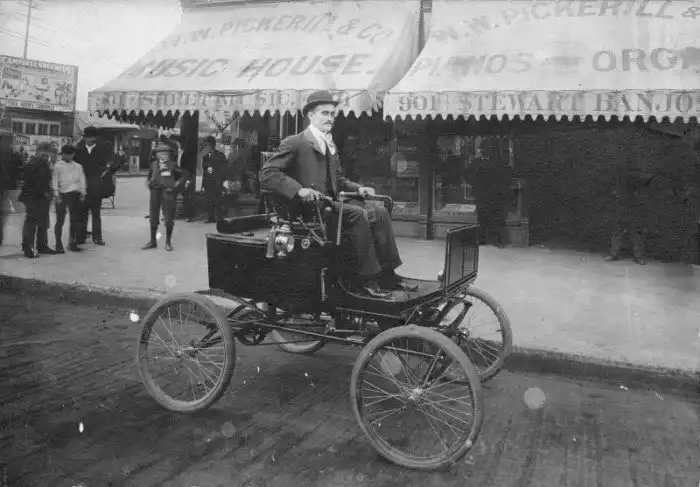 W. W. Pickerill за рулем первого автомобиля в городе, приобретенным за $750. Автомобиль был оснащен двигателем в 4 лошадиной силы. Припаркован в перед магазином мистера Pickerill, "W.W. Pickerill & Co. Music House". Это было сногсшибательным зрелищем: толпы собрались чтобы осмотреть "повозку, которая ехала без лошадей"". Г–н Pickerill позже стал руководителем Вашингтонской Автомобильной Корпорации.