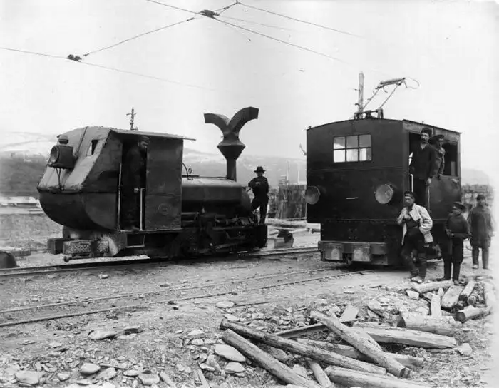 Необычные паровоз и электровоз на Александро-Невском прииске. Российская империя, 1900 год.