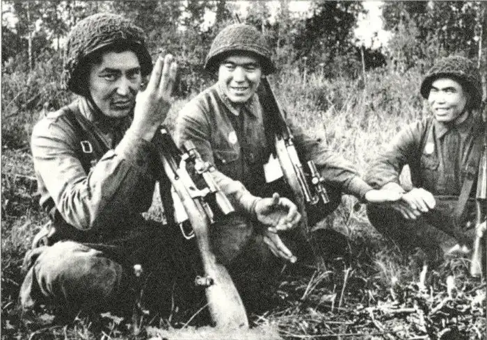 Слева направо: Абиль Нусупбаев показывает, что убил 3-х немцев. К декабрю 1942 года на его счету 88 фашистов. Тулеугали Абдыбеков - к моменту своей гибели в 1944 году записал на свой счет 397 фашистов. Анарбай Ержанов - к декабрю 1942 года имел на счету 89 фашистов.