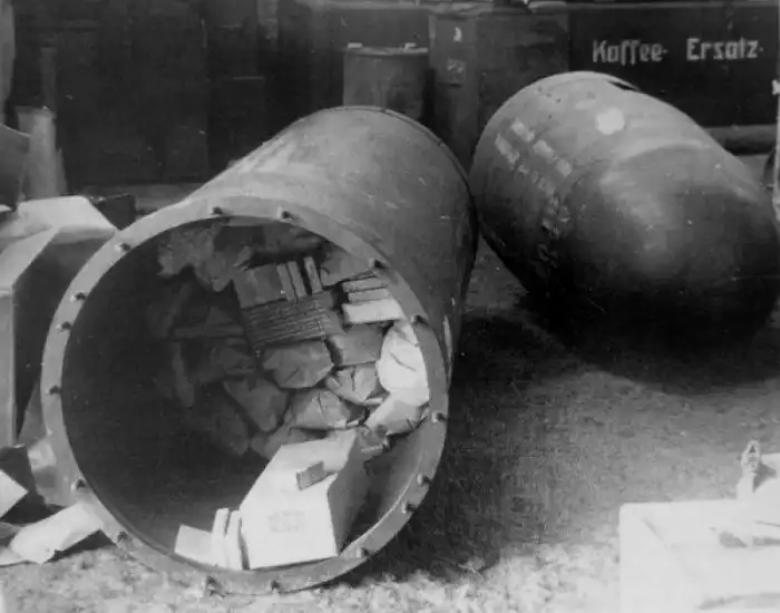 Немецкие грузовые контейнеры, приготовленные для снабжения частей, окруженных под Сталинградом. 1943 год.