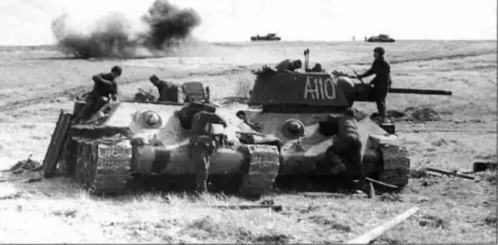 Полевая ремонтная бригада лейтенанта Щукина восстанавливает подбитый танк. Июль 1943 года.