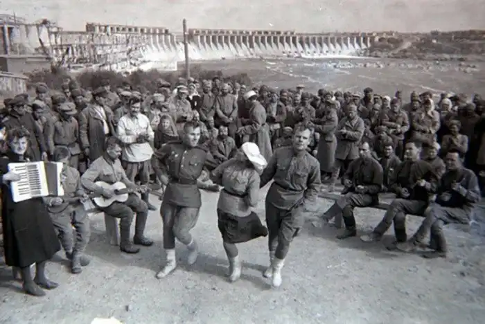 11 инженерно-строительная бригада на восстановлении ДнепроГЭСа. Выступление художественной самодеятельности. 1944 год.