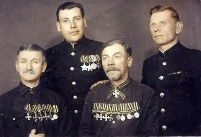 Солдаты Русской императорской армии с сыновьями, солдатами Советской армии. 1948 год.