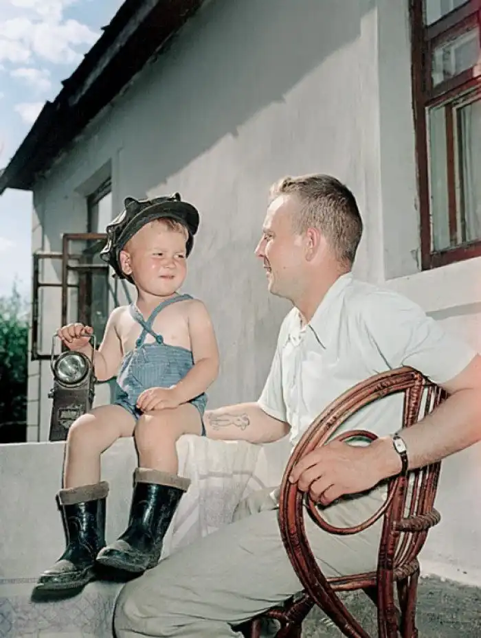 На руке мужчины отчетливо видна татуировка голой женщины. Однако в 1954 году “Огонёк” напечатал этот снимок с подписью «Я тоже буду шахтером!» безо всякой голой женщины — татуировку заретушировали.