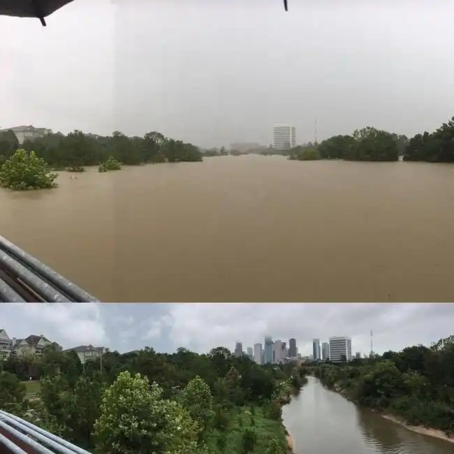 Давайте посмотрим на интересные сравнительные фотографии, сделанные в американском городе Хьюстон, который пострадал от серьезного наводнения. Именно вот так выглядят 400 мм осадков, которые выпали всего за 24 часа. Жуткое и действительно пугающее зрелище.
