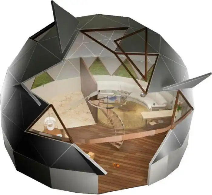 Аэродинамические свойства купола уменьшают сопротивление ветру, не создаются зоны высокого и низкого давления и, как следствие, нет сквозняков и выветривания тепла. В связи с отсутствием прямых углов площадь стен уменьшается на 30%. Использование современных материалов позволит сэкономить на отоплении до 80 процентов энергии.