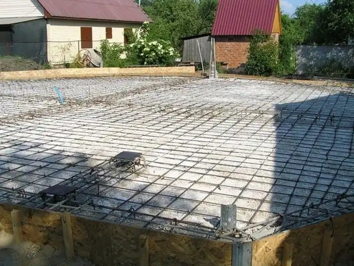 Поверх ростверка кладется арматурная решетка пола и увязывается с арматурной решеткой ростверка. Бетонная плита заливается раствором бетона и получается суммарный ростверк высотой 40 см.