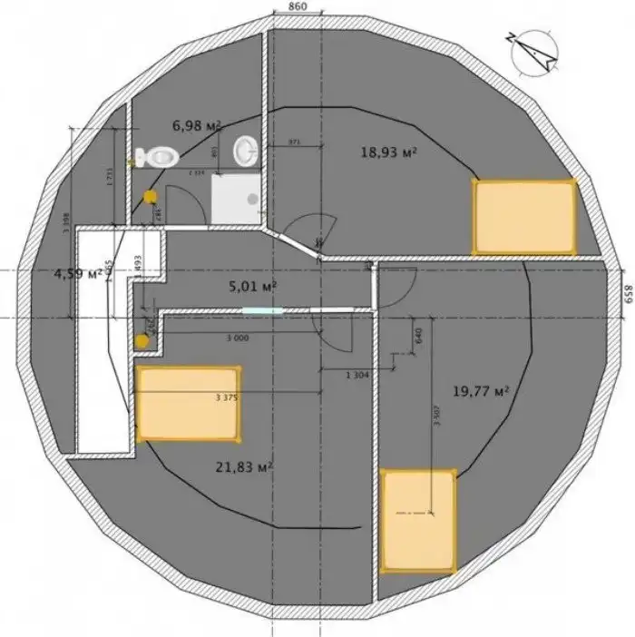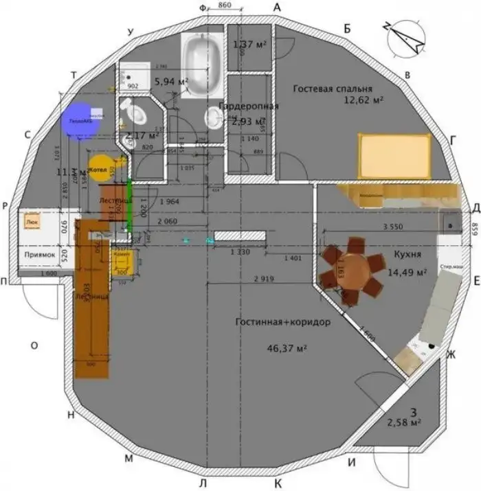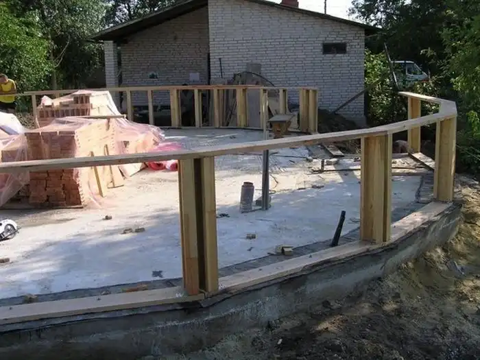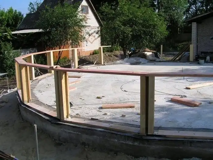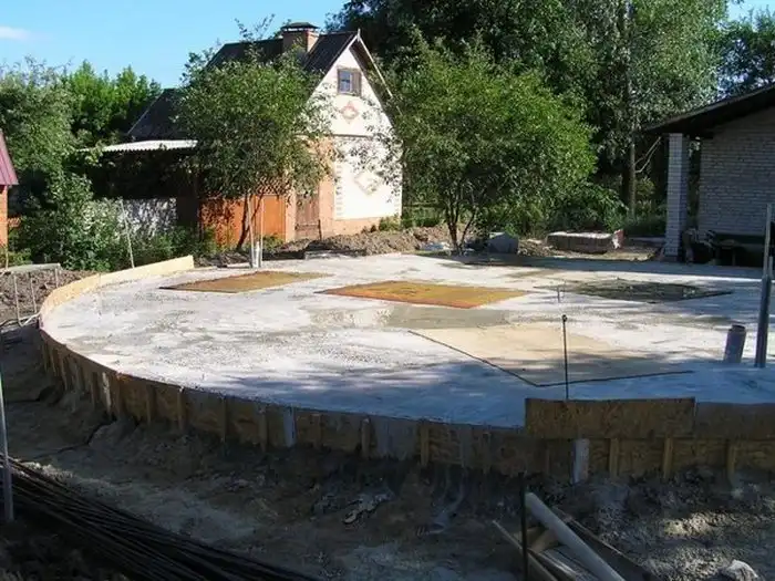 В проекции фундамент не идеально круглый, а состоящий из 20 секторов многоугольник, вписанный в окружность. При проектировании стены было принято решение «утопить» ее по отношению к периметру ростверка вовнутрь на 50 мм, что в дальнейшем вызвало проблемы при проведении работ, связанных с утеплением.