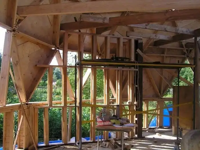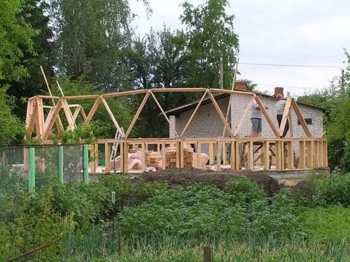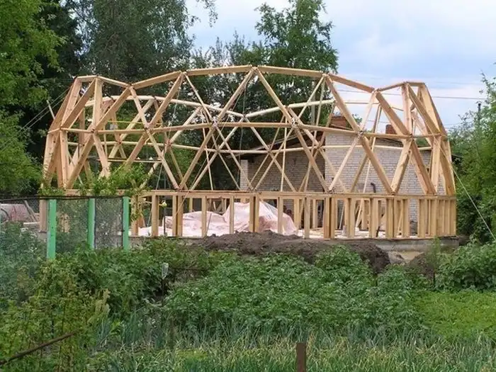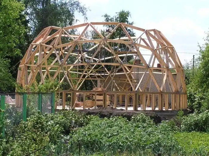 Далее проводился монтаж деревянных конструкций купольной части здания при помощи треугольных равносторонних секторов.