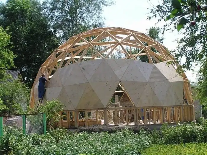 К треугольным секторам фермы полусферы крепится снаружи 15 миллиметровая влагостойкая фанера.
