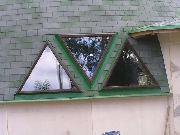 При планировании окон возникли определенные трудности. В результате в доме 15 глухих наклонных оконных треугольных секторов и 5 окон мансардного типа открывающейся конструкции. Мансардные окна пришлось делать минимального размера, чтобы вписать их в конструкцию треугольника стены. Глухие окна - стеклопакет двухкамерный, формула: 6х12х4х8х4, среднее стекло с напылением. Деревянную раму из доски 45х200 изготовили такого размера, чтобы ее края отступали от края треугольника на 10 см.