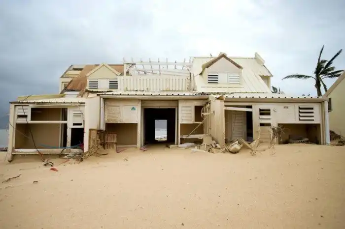 Дом, разрушенный ураганом на острове Сен-Мартен, полностью занесен песком